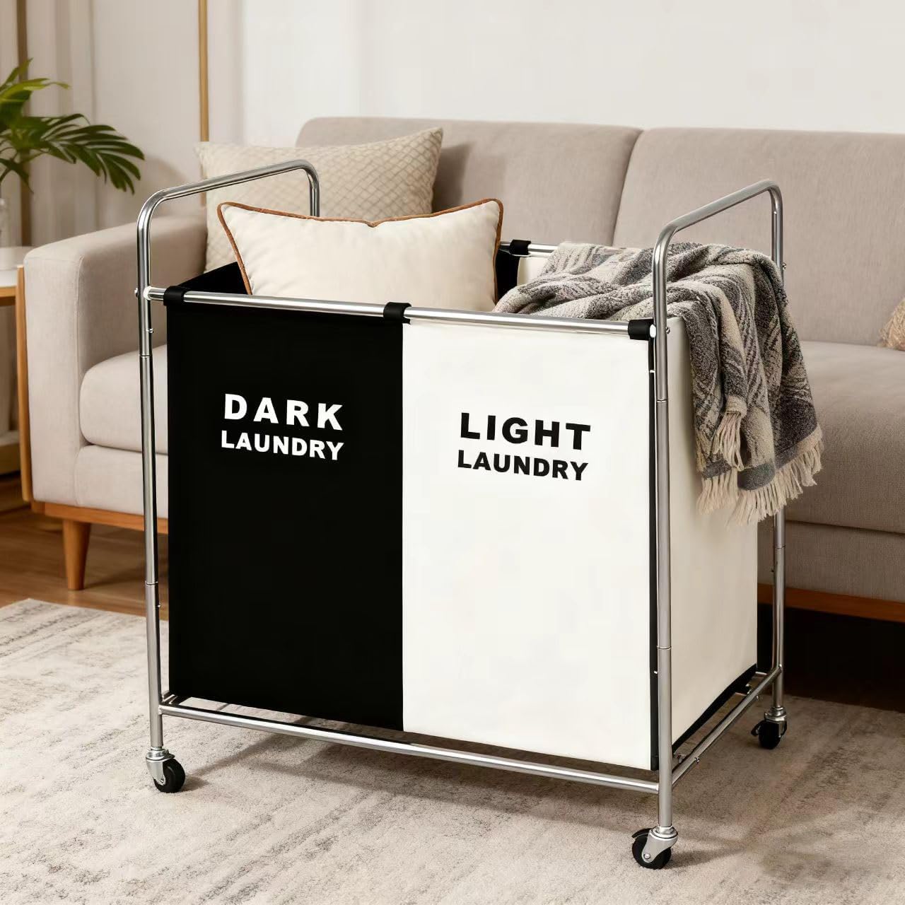 Transform your laundry routine with this practical double compartment rolling laundry sorter cart. The sleek design features two separate compartments clearly marked for dark and light laundry, making sorting clothes effortless and helping prevent color bleeding mishaps. The sturdy chrome frame provides lasting durability while remaining lightweight and easy to maneuver on smooth-rolling wheels. Perfect for bedrooms, laundry rooms, or any space where organization is key, this mobile clothes storage solution keeps your laundry neat and accessible. The hamper's thoughtful design includes convenient handles and a height that reduces back strain during loading and unloading. Each compartment offers ample storage space for multiple loads of laundry. The cart's mobility allows you to easily transport sorted clothes to your washing machine, while its compact footprint helps maximize space efficiency. Whether in a family home or apartment, this versatile laundry sorter combines functionality with contemporary style to streamline your washing routine.
