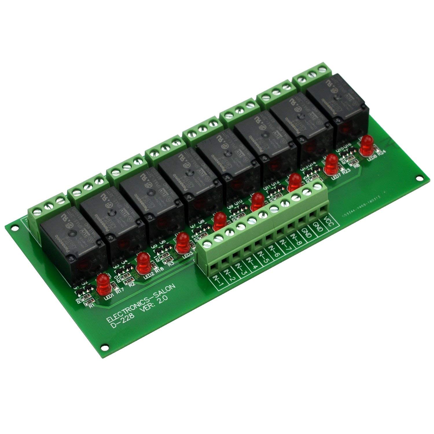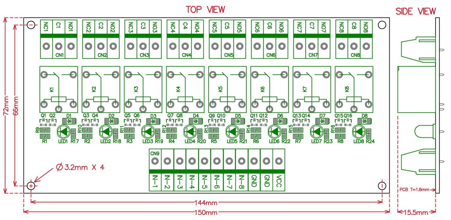 8 Channel 10Amp SPDT Power Relay Module Board. This item has been assembled, and electrical test passed. JS1-5V-F Power Relays. LED indicator for each relay channel. Darlington transistors circuit driving relay, improve the reliability of action. FR-4 Fiber glass PCB (Double Layer). Operating Voltage/Current(max.): DC5V / 720mA (relay all action). Input control signal voltage: 0V - 0.5V Low state (relay not-action), 2.5V - 20V High state (relay action). Input control signal high state current: 2.5V: 0.1mA. 5V: 0.35mA. 12V: 1.1mA. 24V: 2.4mA. Relay Spec: Part Number: JS1-5V-F Power Relays. Contact Rating: 125VAC/250VAC 10Amp or 30VDC 5Amp. Wire connection and PCB size: VCC: Power supply input. GND: Power supply ground and control signal ground. CH-x: Control signal input, Low: relay OFF, High: relay ON. COM / NO / NC: (Cx=COMx) . Control signal state low, the relay OFF, COM - NO disconnected, COM - NC connected. Control signal stage high, the relay ON, COM - NO connected, COM - NC disconnected.This is a very simple module board, no paper specifications, any questions, feel free to tell me. Datasheet: https://images-na.ssl-images-amazon.com/images/I/91AHtk3PT3L.pdf
