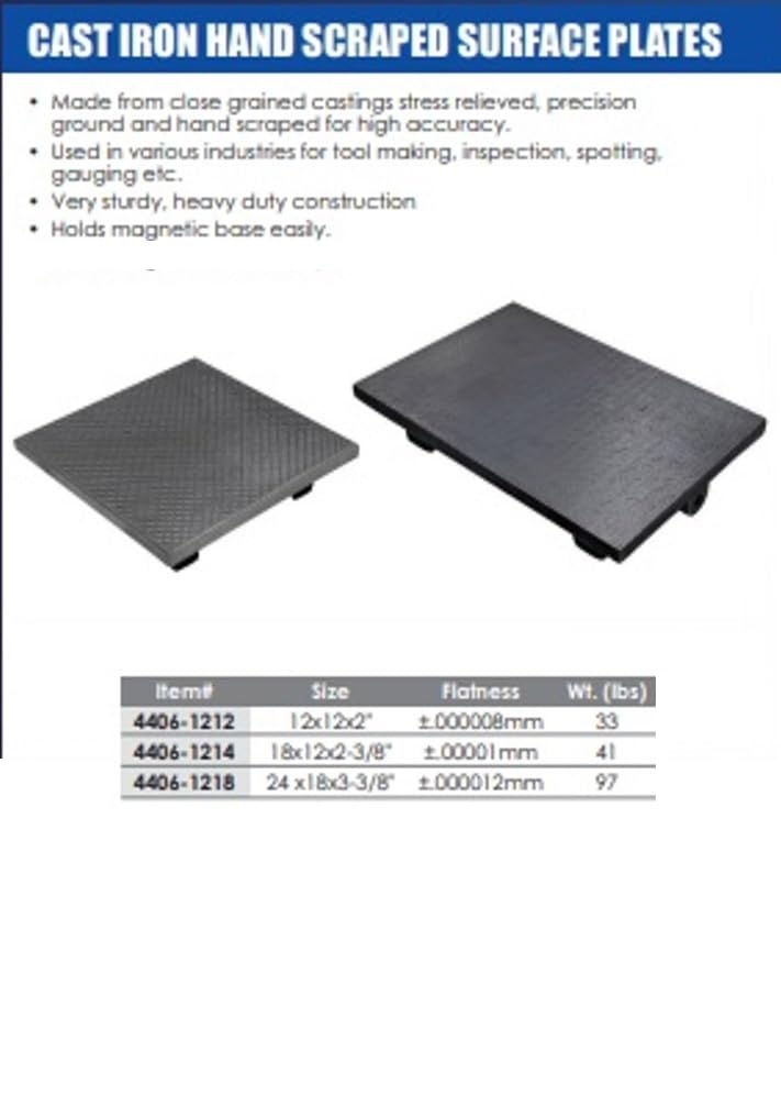 HHIP 12 X 12 X 2" Cast Iron Hand Scraped Surface Plate Made from close grained castings stress relieved, precision ground and hand scraped for high accuracy. Used in various industries for tool making, inspection, spotting, gauging etc. Very sturdy, heavy duty construction. Holds magnetic bases easily. Flatness accuracy of 8.0 microns refers to a geometric tolerance that specifies the maximum allowable deviation of a surface from a perfectly flat plane. In simpler terms, it means the surface must stay within a tolerance zone of 8 micrometers (µm) or 0.008 mm.
