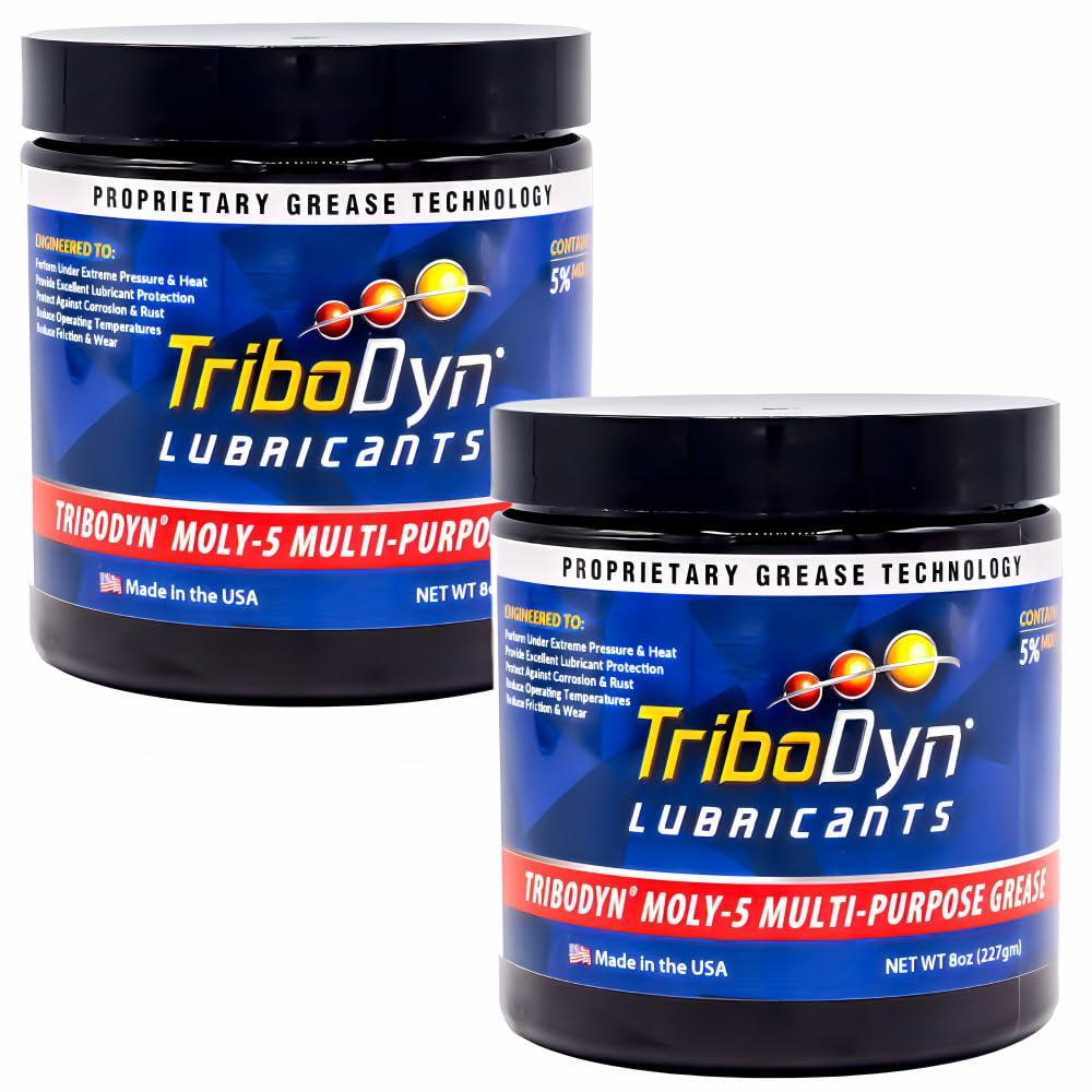 TriboDyn Moly-5 Multi-Purpose HTEP Grease – 5% Molybdenum Disulfide NLGI #2 Lithium Complex – Extreme Pressure & Heavy-Duty Protection Upgrade Your Maintenance with the Power of Moly Tired of standard greases that can't handle heavy loads and high shock? TriboDyn Moly-5 Multi-Purpose HTEP Grease is engineered for those who demand more. Specially formulated with a minimum of 5% Molybdenum Disulfide (Moly), this lithium complex grease provides a robust protective layer that drastically reduces friction and wear, extending the life of your valuable components. Whether you're servicing your pickup truck, maintaining farm equipment, or demanding peak performance from your machinery, Moly-5 is the heavy-duty solution you can trust. It meets stringent GC-LB standards, ensuring protection for both high-speed wheel bearings and high-load chassis points. Key Benefits Extreme Pressure (EP) Protection: 5% Moly forms a durable, low-friction film that withstands shock loads and heavy pressure without breaking down. Superior Wear Reduction: Minimizes metal-to-metal contact on bearings, joints, U-joints, and gears. Excellent Water Resistance: Resists washout from rain, mud, or washdowns, sealing out contaminants. High-Temperature Stability: Performs reliably in hot conditions without thinning or throwing off. Versatile & Non-Corrosive: Safe for all metal types, including sensitive yellow metals (bronze, brass, copper). Ideal for a Wide Range of Applications Automotive & Trucks: Wheel bearings, ball joints, tie rod ends, U-joints, and chassis lubrication points. Heavy Equipment: Excavators, loaders, and construction machinery where shock loads are common. Agricultural: Tractors, implements, and equipment exposed to dirt, water, and heavy stress. Any application where the manufacturer specifies the use of a 5% moly grease. Compliance & Performance Meets or exceeds ASTM D4950 GC-LB and NLGI GC-LB standards for automotive wheel bearing and chassis applications. Choose the grease that works as hard as you do. Choose TriboDyn Moly-5 for unmatched protection in demanding conditions. TriboDyn – Engineered for the Driven.