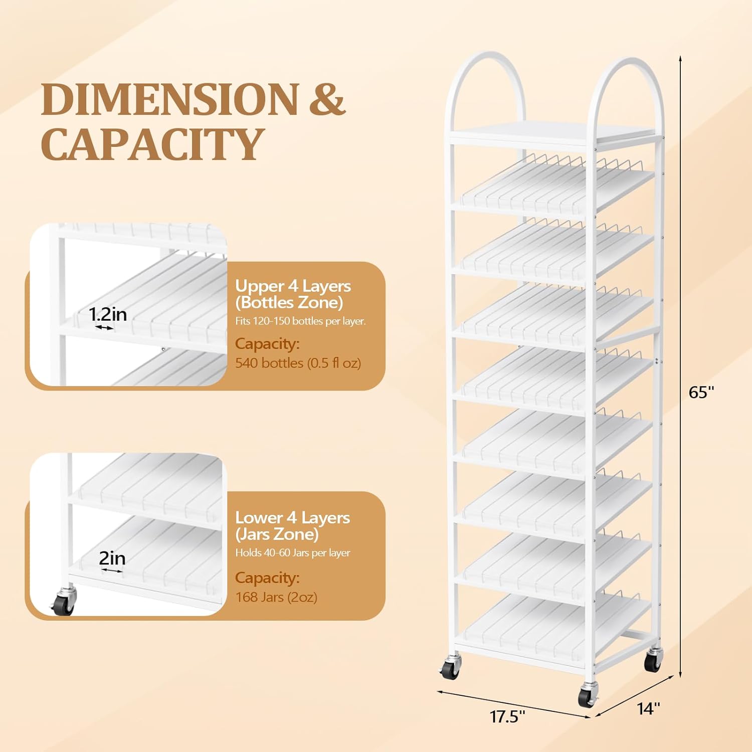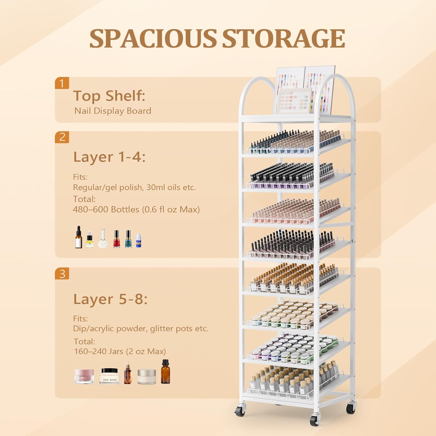 Bring order and efficiency to your salon with the Omysalon Rolling Nail Polish & Powder Rack. This professional, wheeled storage solution is designed to transform cluttered spaces into a streamlined, productive workspace.Key Features & Benefits:Total Mobility: Equipped with 4 smooth-rolling casters (2 with brakes), this salon display rack moves effortlessly between workstations. Easily transition your entire inventory from the work zone to the display area in seconds.Massive, Smart Capacity: The intelligent 8-tier design offers dedicated storage for all your supplies. The upper 4 slanted shelves securely hold 480-600 polish bottles, while the lower 4 flat shelves are perfect for 160-240 powder jars. The top shelf doubles as a premium display for your nail art.Built for Professionals: Crafted from sturdy, commercial-grade metal, this rack is engineered for stability under heavy loads. The slanted shelves with metal baffles keep bottles organized, visible, and within easy reach.Upgrade Your Space Today!Stop wasting time searching for supplies. Choose the Omysalon salon display rack—the smart, sturdy, and mobile solution that puts everything you need right at your fingertips.