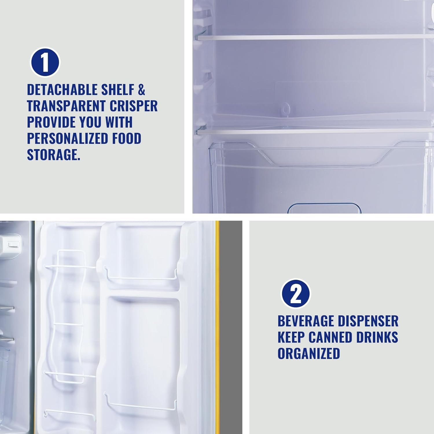 Upgrade for your kitchen This compact refrigerator combines simple design with great functionality and allows you to optimally store many refrigerated goods. Whether frozen snacks and ice cream, chess, milk, beer or vegetables, you always have a compact cooling space available that keeps the most important fresh. For a smaller household or as a second appliance – This compact refrigerator with a 75 Liters of usable capacity and adjustable shelves, is ideal storage for your Home. DUAL DOOR DESIGN Our refrigerator has dual door design. It is a compact refrigerator with freezer for daily use. 7 TEMEPERATURE THERMOSTAT There are 7 variable temperature settings from 32℉ to 50℉, keeping food's freshness lasting longer at proper temperature. LOW NOISE Our compact refrigerator maintains a quiet working environment, you will enjoy a low noise life. ADJUSTABLE FEET Equipped with adjustable leveling Leg, suitable for apartment, garage and office. FEATURES ✔Crisper Drawer ✔Dual Door Design ✔LED Lighting Design ✔Adjustable Thermostat ✔Removable Glass Shelves ✔Leveling Leg ✔Flexible pulley ✔Low Noise SPECIFICATIONS Capacity: 3.2 cu.ft Dimension: 17.7"*19.3"*35.43" Weight: 50lbs Temperature Range: -0.4℉ to 50℉ Compressor: R600a Inside