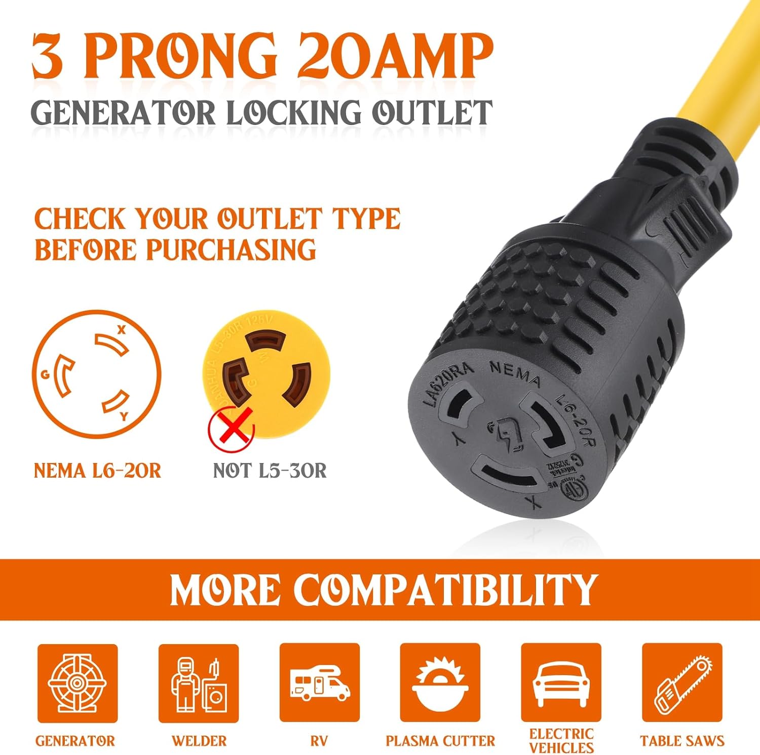 Features: Convenient size: With its length approximately 15 ft/ 4.57 m, this L6-20 extension cord ensures ample reach for your devices and appliances. Its size is nice as it balances maneuverability and coverage to meet your need. Aesthetically appealing: The black and yellow coloring of the extension cord not only adds visual appeal, but also serves a functional purpose. The yellow design enhances safety by making it easily visible and avoidable. Specifications: Color: black, yellow Size: about 15 ft/ 4.57 m Package includes: 1 x L6-20 extension cord Notes: Manual measurement, please allow slight errors on size. The color may exist a slight difference due to different screen displays.