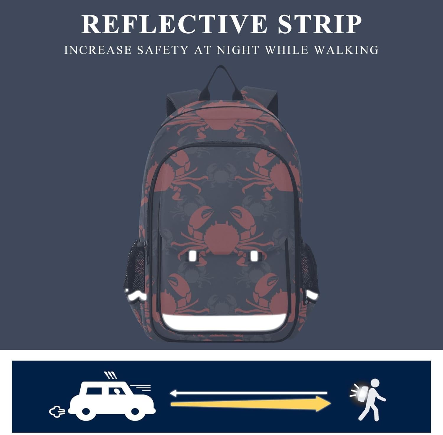 Specifications Book bag dimension: 12.9 x 6.72 x 17.7 in/33 x 17 x 45 cmFeatures Roomy main compartment: the main compartments offer a separated space for your laptop up to 15.6 inch, iPad, charger ,book, pen, pencil bag, calculator, clothes, ect. Easy find what you want.Front insert pocket can carry small notebook, ID, cell phone, pens or other little supplies.Mesh pocket: it adjusts to fit a water bottle or juice box.Reflective Strips Design: there are reflective strips on the front and side of the backpack to ensure the safety of traveling at dark night.Comfortable wide strap, reduce shoulder pressure, prevent load deformation.Thickened back pad, increase back comfort and permeability.Multipurpose A great backpack for back-to-school gift. It can be used as computer bag, primary school student backpack, middle school student backpack, gym bag, duffel bag, laptop backpack and sport bag.Perfect Gift Personalized customization, makes you unique. It's good ideal gift for back-to-school. It also is great thanksgiving,christmas, birthday, valentine gift for your best friends, boy, girl friends, family members, classmates etc.Occasions School, work, traveling, hiking, camping, trekking, cycling , gym, sportsWarm Tips It is recommend to wash by hand, hang to dry in the shade, iron at low temperature, do not rinse, do not wring (can be partially squeezed)